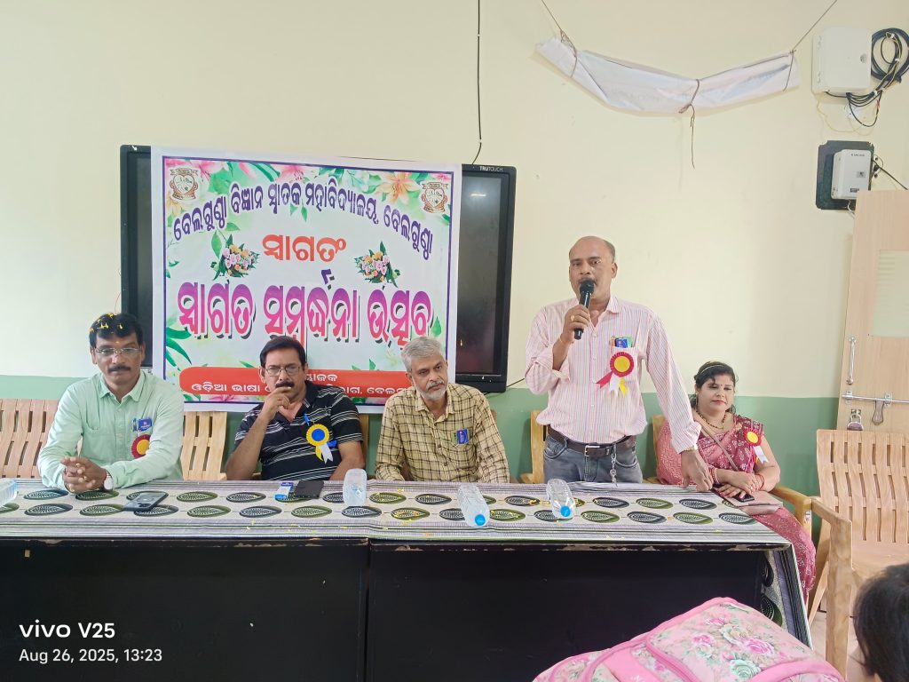 ବେଲଗୁଣ୍ଠା-:26.08,:ବେଲଗୁଣ୍ଠା ବିଜ୍ଞାନ ସ୍ନାତକ ମହାବିଦ୍ୟାଳୟ ର ଓଡ଼ିଆ ଭାଷା ଓ ସାହିତ୍ୟ ବିଭାଗର ନବାଗତ ଛାତ୍ରଛାତ୍ରୀ ଙ୍କ ସ୍ଵାଗତ ସମ୍ବର୍ଦ୍ଧନା ଉତ୍ସବ ବିଭାଗୀୟ ମୁଖ୍ୟ ସପନ କୁମାର ପ୍ରଧାନଙ୍କ ସଭାପତିତ୍ୱ ରେ ଅନୁଷ୍ଠିତହୋଇଯାଇଛି। ମୁଖ୍ୟ ଅତିଥି ରୂପେ ମହାବିଦ୍ୟାଳୟର ଅଧ୍ୟକ୍ଷ ଅଜିତ କୁମାର ପଟ୍ଟନାୟକ ଯୋଗଦେଇ ଛାତ୍ରଛାତ୍ରୀଙ୍କୁ ମୂଲ୍ୟବୋଧ ଉପଦେଶ ଦେଇଥିଲେ ।