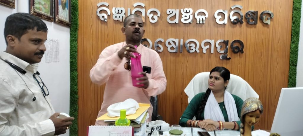 ପୁରୁଷୋତ୍ତମପୁର ତା-୧୯l0୮/ ଭେକ୍ଟର ବାହିତ ରୋଗ ନିୟନ୍ତ୍ରଣ କାର୍ଯ୍ୟକ୍ରମ ଓଡିଶା ସରକାର ଏବଂ ଜିଲ୍ଲା ସ୍ୱାସ୍ଥ୍ୟ ସମିତି ଗଞ୍ଜାମ ପକ୍ଷରୁ ପୁରୁଷୋତ୍ତମପୁର ବିଜ୍ଞାପିତ ଅଞ୍ଚଳ ପରିଷଦ ଅଞ୍ଚଳରେ ଗତ ୧0 ରୁ ୨୩ ଯାଏଁ ଫାଇଲେରିଆ ନିରାକରଣ ପାଇଁ ଘର ଘର ଯିବା ସହିତ ବିଭିନ୍ନ ଶିକ୍ଷା ଅନୁଷ୍ଠାନ, ଏବଂ ବିଭିନ୍ନ ଅଫିସ ଦପ୍ତରକୁ ଯାଇ ତହସିଲଦାର ସନ୍ତୋଷ କୁମାର ସାହୁ, ବିଡ଼ିଓ ବିଜୟ କୁମାର ବେହେରା,